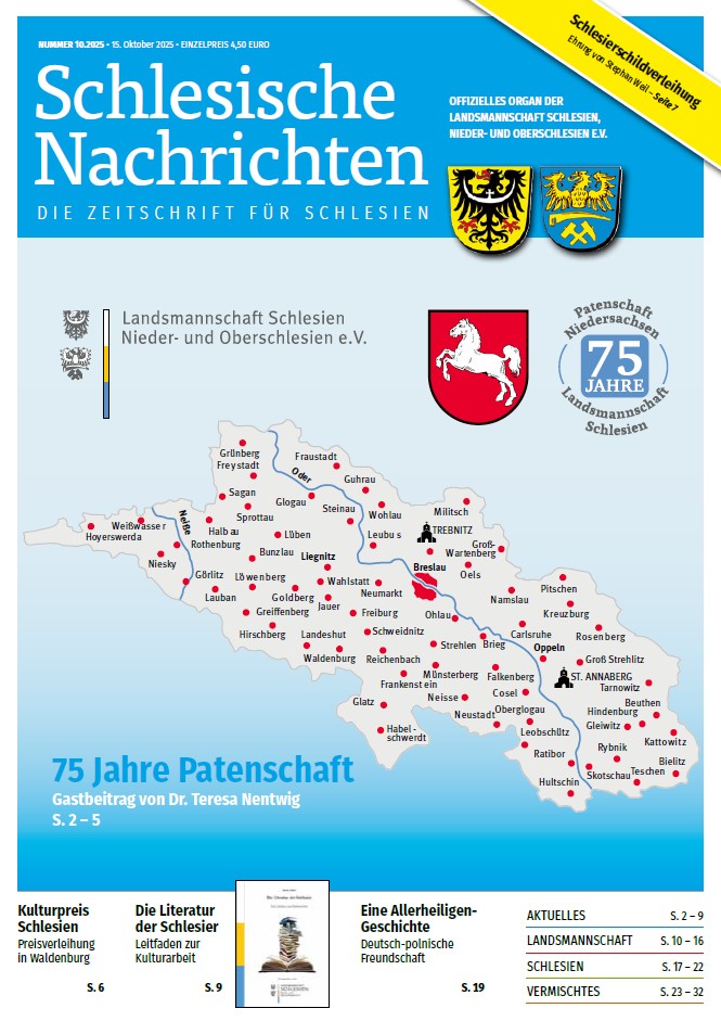 In dieser Ausgabe: Die Patenschaft des Landes Niedersachsen für die Landsmannschaft Schlesien. Exklusiv-Gastbeitrag von Dr. Teresa Nentwig | Schlesierschildverleihung. Ehrung von Stephan Weil | Kulturpreis Schlesien. Preisverleihung in Waldenburg | Wir loben dich, heilige Mutter Anna! St. Annaberg-Gedächtniswallfahrt in Königstein | Schlesierkreuz-Verleihung. Edeltraud und Horst Gniesewitz geehrt | Jacob Böhme. Das Leben eines Mystikers […] u.v.m.