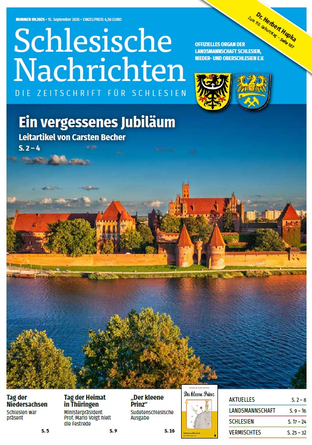 In die­ser Aus­ga­be: Ein ver­ges­se­nes Jubi­lä­um. 500 Jah­re Preu­ßen: Vom Ordens­staat zum evan­ge­li­schen Her­zog­tum. Leit­ar­tilel von Cars­ten Becher | Schle­si­en begeis­tert. Die Lands­mann­schaft Schle­si­en erneut mit eige­nem Stand beim Tag der Nie­der­sach­sen | „Bis ans Meer“. Der ers­te Roman von Peg­gy Patzschke | In Erin­ne­rung: Her­bert Hup­ka. Zum 110. Geburts­tag | Infor­ma­ti­ons- und Begeg­nungs­fahrt nach Schle­si­en. Die Lan­des­grup­pe Nie­der­sach­sen berich­tet | Gedenk­stun­de. Lan­des­ver­band der Lands­mann­schaft Schle­si­en in Sach­sen | Begeg­nung in Dres­den. Tref­fen mit der Jugend der Deut­schen Min­der­heit aus Oppeln […] u.v.m.
